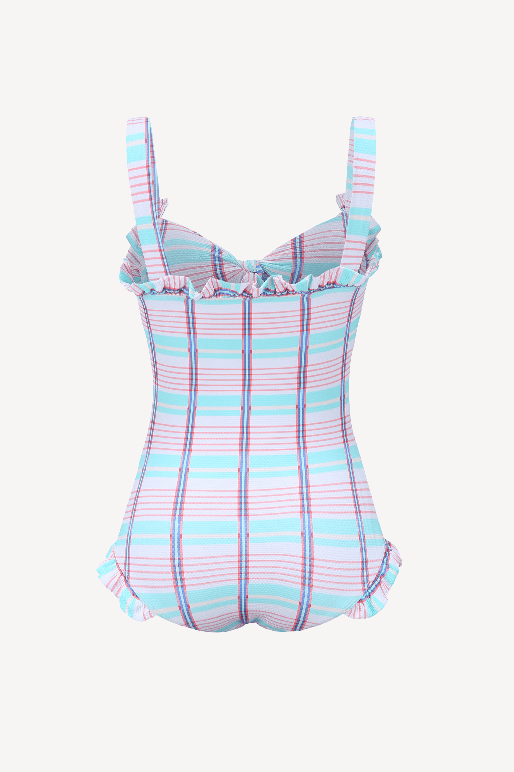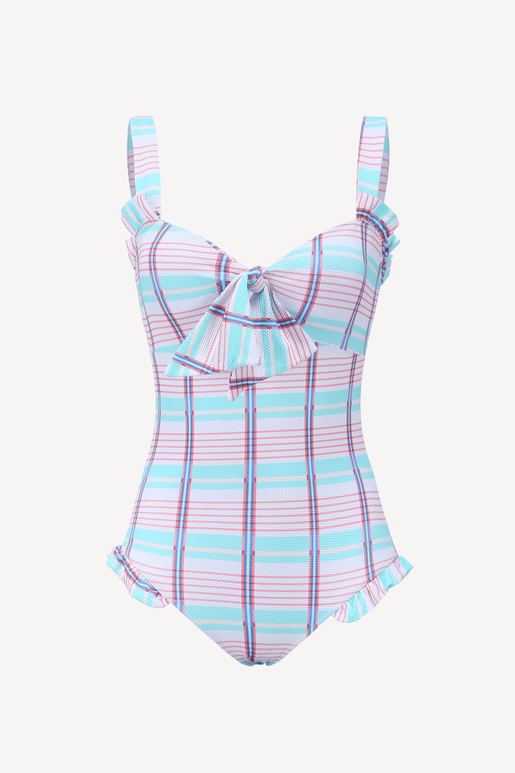 3. Multicolored checkered swimsuit with bow detail on a white background