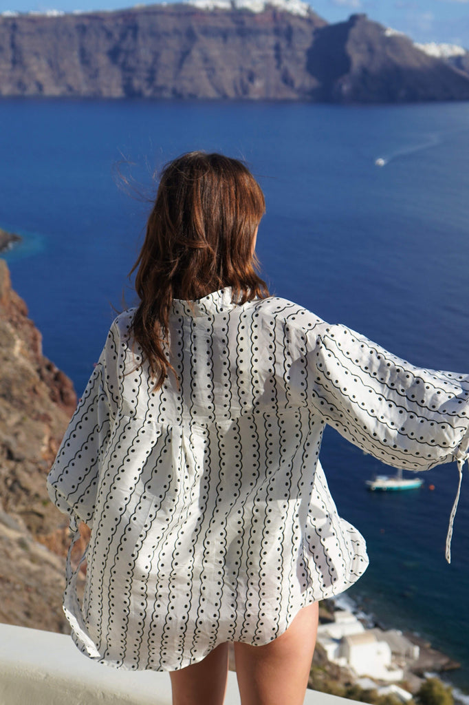The classic beach shirt, reimagined with a twist. This is your elevated throw-on-and-go piece — oversized, airy, and designed to move with you. Crafted from soft, breathable silk the PAPER Beach Shirt features dramatic dropped sleeves and a subtle monochrome stripe print that gives it a subtle flash of flair.